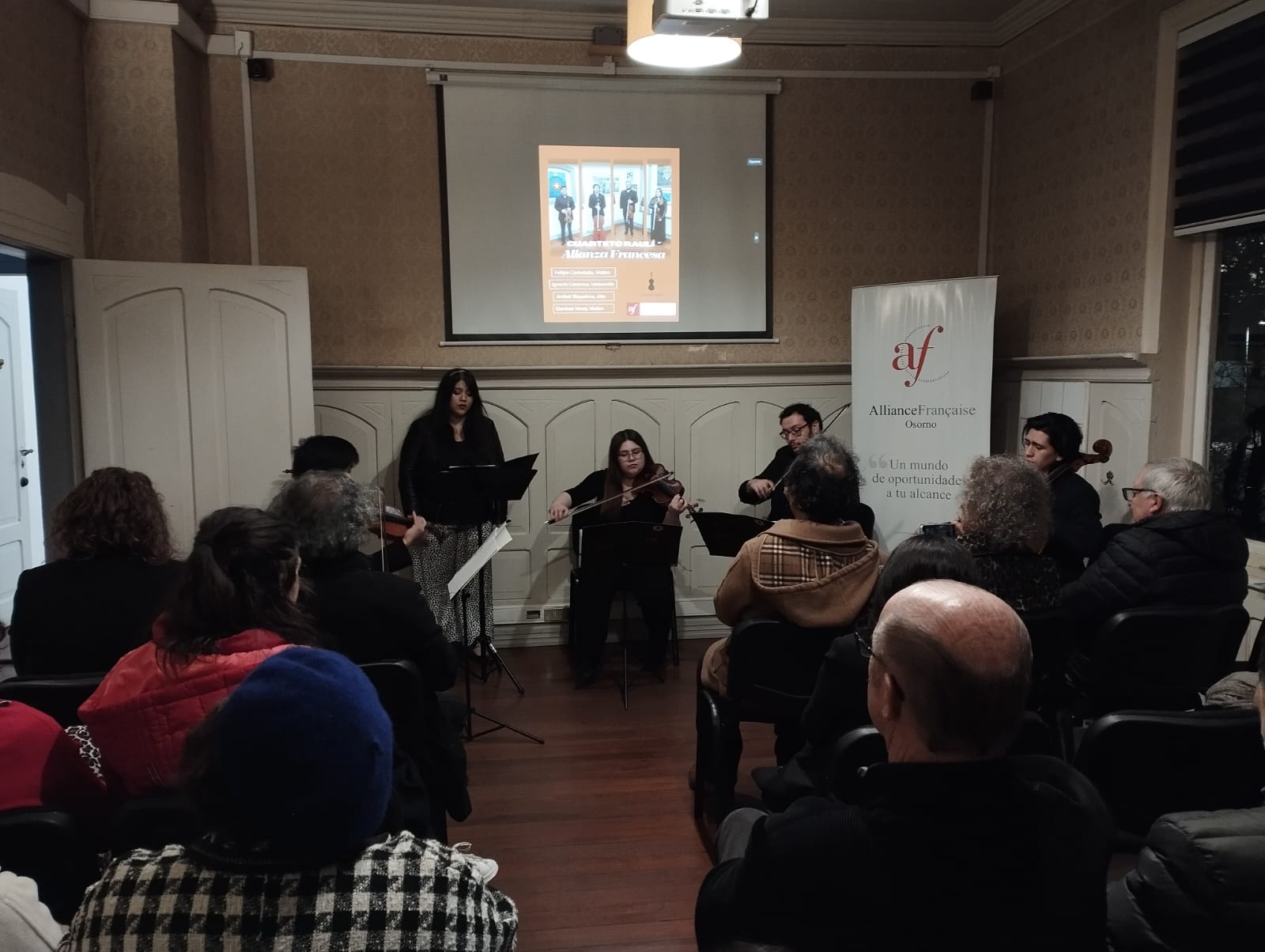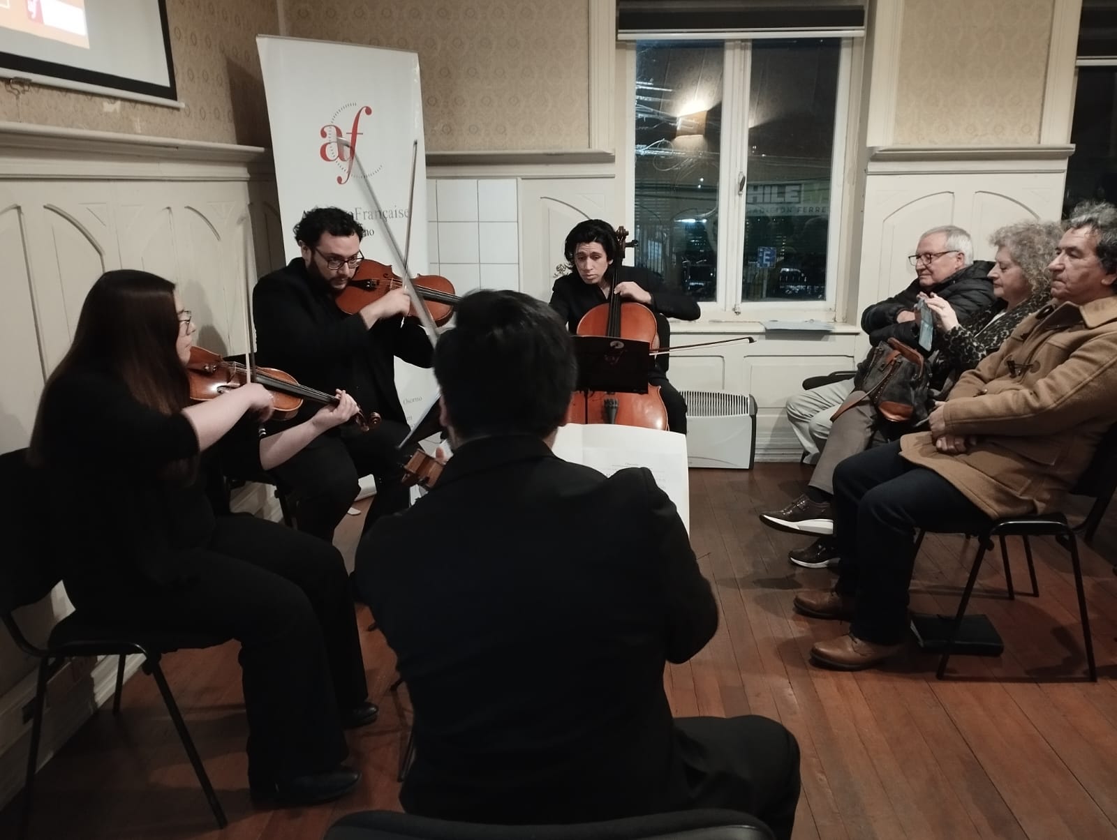 El lunes 14 de julio, celebramos con nuestros invitados el día nacional de Francia: directivos, socios, representantes del mundo asociativo, instituciones educativas, agrupación transdisciplinaria Kabal, delegación de la Pompe France de Rio Bueno, profesores y muchos otros pudieron primero apreciar la destreza de los alumnos de 8° básico del Lycée Claude Gay, quienes con su profesora Marcela Torres crearon maquetas inspiradas en pintores impresionistas franceses, luego disfrutar de la calidad artística de los componentes del cuarteto de cuerdas Raulí acompañados excepcionalmente por la profesora de canto lírico de la alianza, Lorena Millar, finalmente presenciaron la entrega de un galvano en honor a los 80 años del Lycée Claude Gay y el homenaje a quien fue profesor, cónsul honorario y miembro de la AF durante casi medio siglo, Claudio Broussaingaray, gracias a las muy sentidas palabras de la presidenta de la corporación, Natalia Arraya.